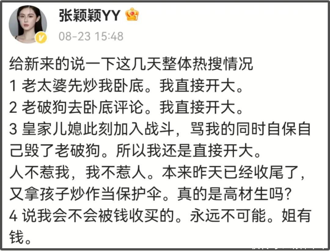 张颖颖写了这几天的“开战总结”,除了她开大怼张兰和马筱梅之外,她还说自己没有被钱收买,更强调她有钱,永远也不会被收买。